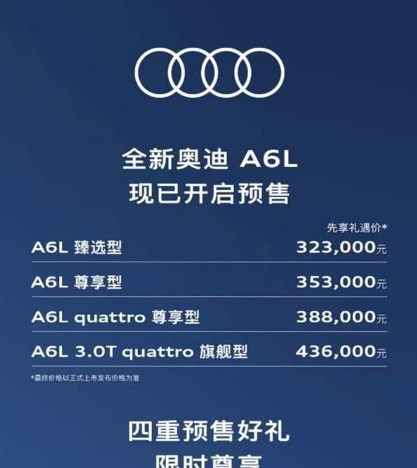 全新奥迪A6L换代车型已经开启预售,起售价定在32.3万元,这个数字一出来就让很多人眼前一亮。过去买一台中大型豪华轿车,动不动就要四十多万起步,现在门槛直接拉低不少,相当于省下能买辆小车的钱。很多人纠结买车时最怕的就是花了大价钱却觉得不值,这次奥迪直接把价格打下来,确实戳中了不少人的痛点,尤其是那些想一步到位开上豪车,又不想把钱包掏空的朋友。
