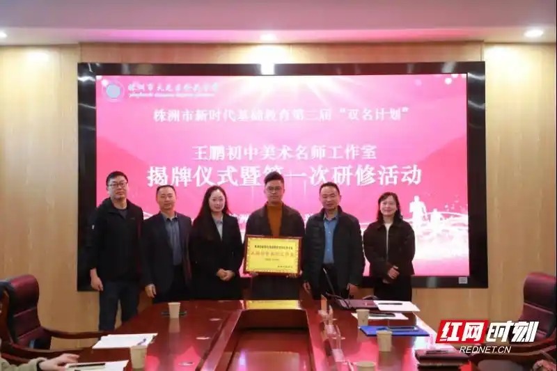 本次活动以 “艺术素养导向下的初中美术教学研究与工作室建设”为主题,既是工作室正式启航的重要仪式,也是区域美术教育同仁共研教学、共谋发展的专业盛会。揭牌仪式上,隆兴中学党总支书记杨雄敏对工作室落户学校表示热烈欢迎与全力支持,强调美术教育要坚守为党育人、为国育才的初心,以美育人、以美化人、以美培元,充分发挥名师引领示范作用,带动青年教师快速成长,形成百花齐放的美育生态,打造具有株洲特色的美术教育成果。株洲市教师培训中心工会主席匡锋为美术特级教师奉丹颁发工作室指导专家聘书,勉励专家为工作室发展把脉定向、传经送宝。工作室主持人王鹏阐述了工作室“成己达人,向美而行”的核心理念,明确以中华优秀传统文化主题的大单元教学为研究核心,通过课题研究、课例研磨、送教帮扶等举措,构建教师专业发展共同体。工作室成员代表吴丹丹、指导专家奉丹、天元区教育科学研究室师训教研员李斌先后发言,对工作室建设提出深耕研究、抱团成长、辐射引领的殷切期望。随后,与会领导、专家共同为工作室揭牌,红绸落下,标志着工作室正式启动运行。