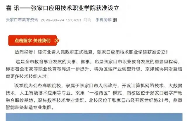 据张家口市教育局官方微信公众号消息,3月24日,经河北省人民政府正式批复,张家口应用技术职业学院获准设立。
